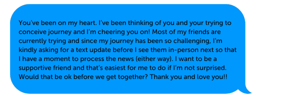 The infertility journey is total shit, but one thing I’m grateful for is the learning and growth I’ve had around boundaries. This text message is one example. I’ve sent a version of this to a few friends and get butterflies each time. It feels strange to make a request about something so personal to someone else; AND I know it’s needed. After the recurring heartbreak of infertility and loss, it’s needed for me and my well-being, and also for the well-being of our friendship. I also trust that I’ve surrounded myself with loving people who will understand and respect this type of request.